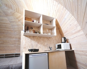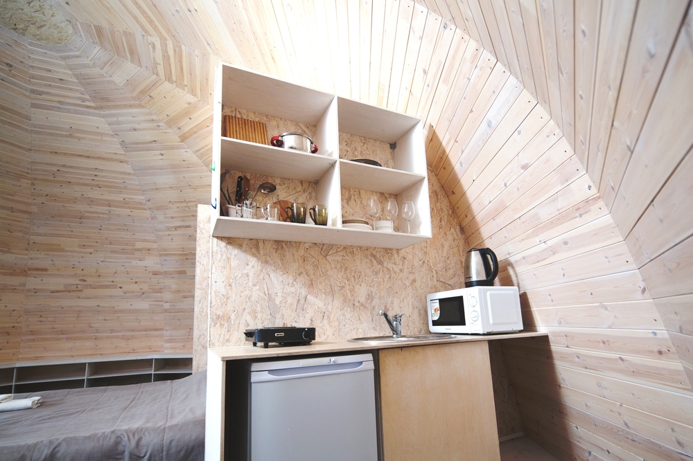 Удобства: Всё для автономного отдыха — собственная мини-кухня с холодильником, индукционной плитой, микроволновкой и чайником, полноценный санузел с душем. В номере есть посуда, банные халаты и все необходимые мелочи.