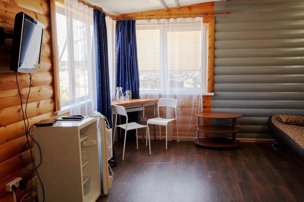 Удобства в номера: Номер имеет отдельный вход и полностью благоустроен: собственный душ и туалет. В оснащение входит холодильник, телевизор, чайник, а также полотенца, средства гигиены и набор для воды.