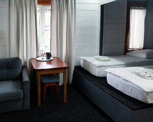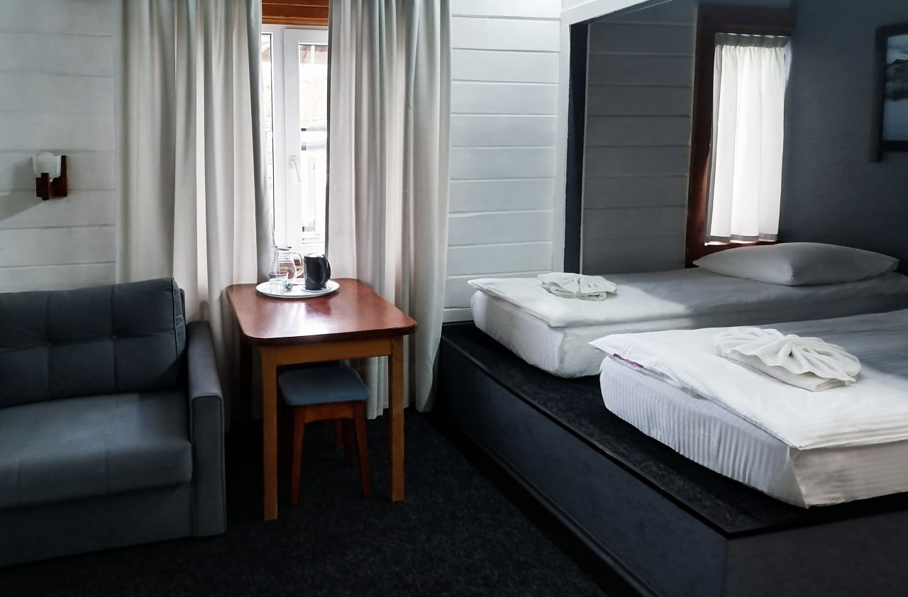 Гибкость в выборе спального места: Доступны две конфигурации: семейный номер с большой двуспальной кроватью и раскладным диваном или стандартный номер с двумя односпальными кроватями.